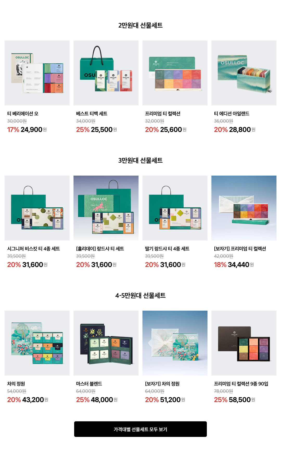 프리미엄 티 컬렉션 9종 90입 보러가기 가격대별 선물세트 모두 보기티타임을 완성하는 구성, 선물의 만족도를 높이세요