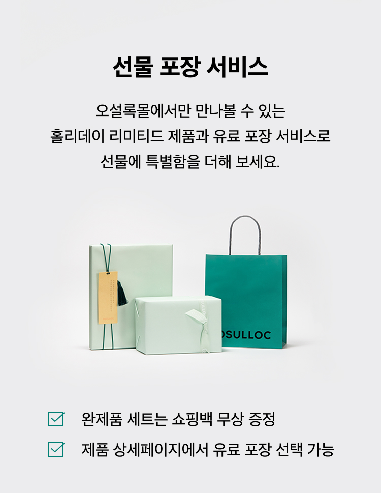 오설록몰에서만 만나볼 수 있는 홀리데이 리미티드 제품과 유료 포장 서비스로 선물에 특별함을 더해 보세요.