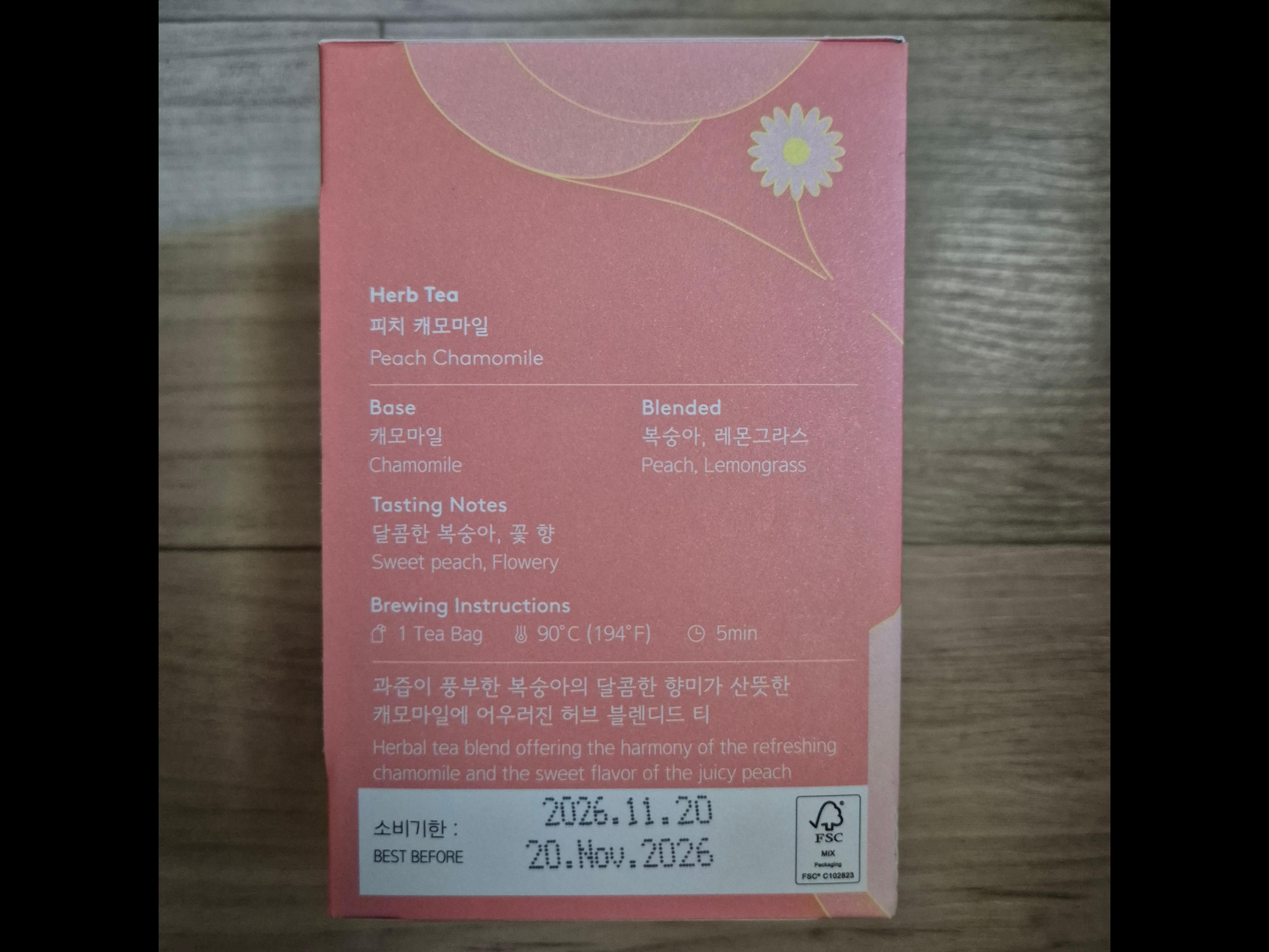 산뜻한 꽃 향미에 복숭아의 달콤함이 어우러진 캐모마일 허브티