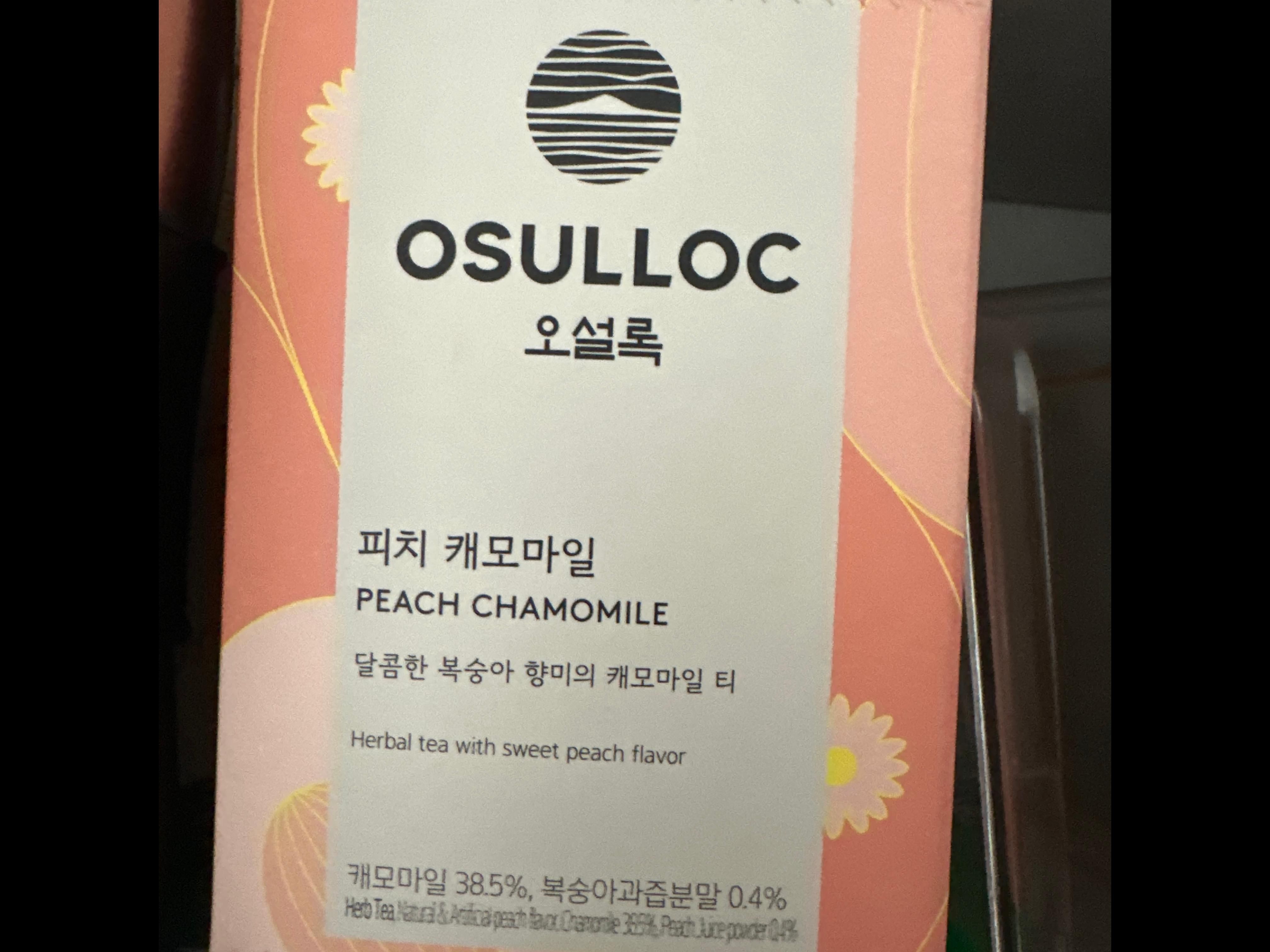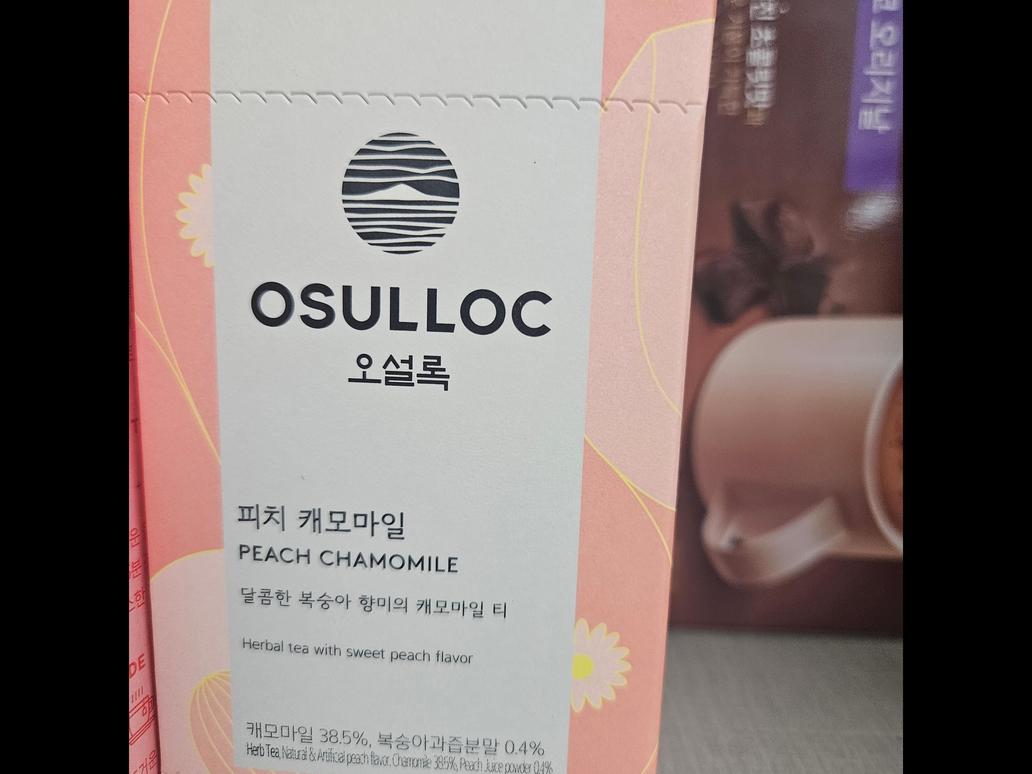 오설록 피치 캐모마일은 가로 69mm, 세로 80mm, 높이 122mm 크기의 종이 상자로 포장되어 있습니다.