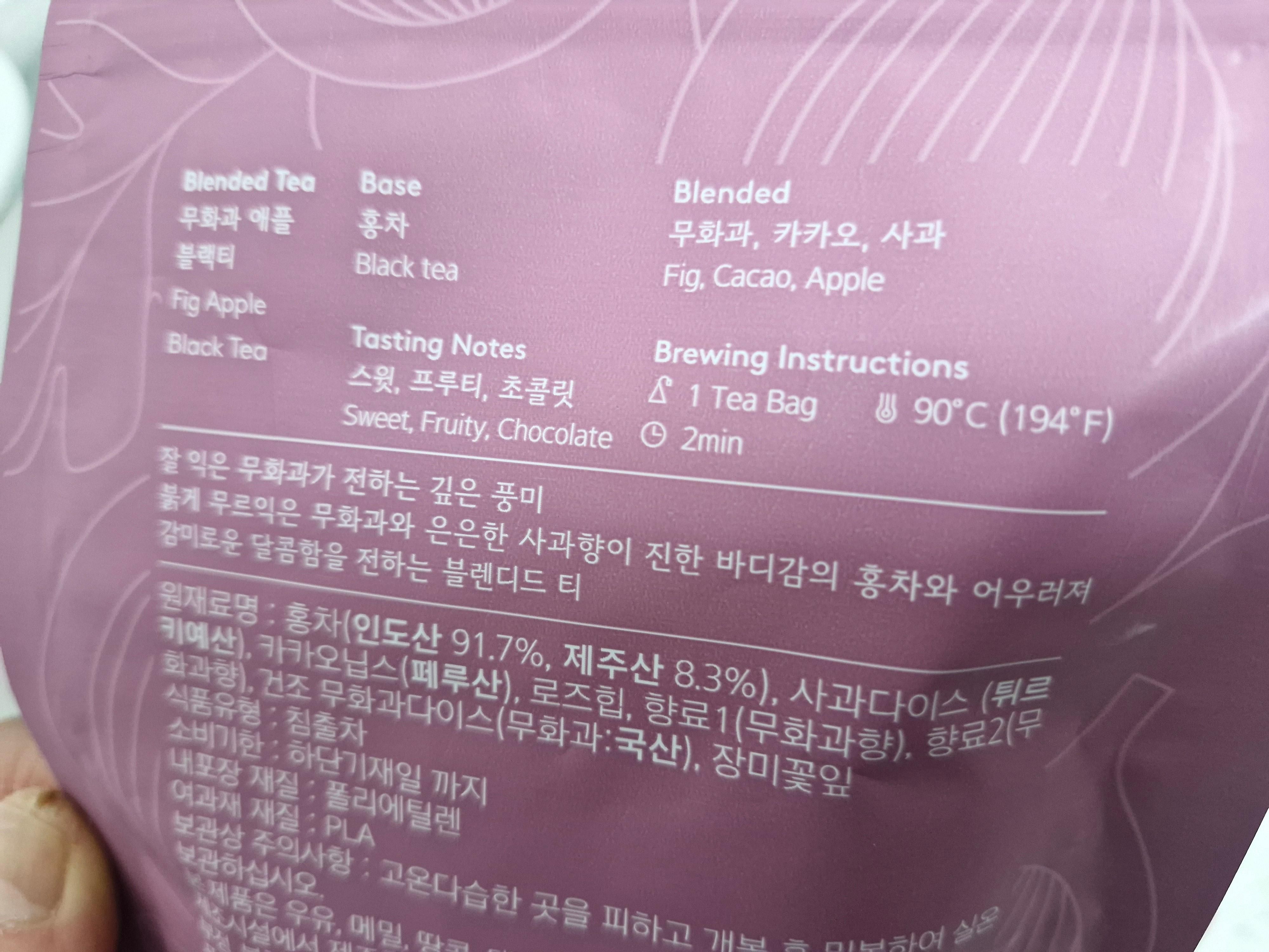 | 원재료명 및 함량 | 홍차(인도산 91.7%, 제주산 8.3%), 사과다이스 (튀르키예산), 카카오닙스(페루산), 로즈힙, 향료1(무화과향), 향료2(무화과향), 건조 무화과다이스(무화과:국산), 장미꽃잎 | ||