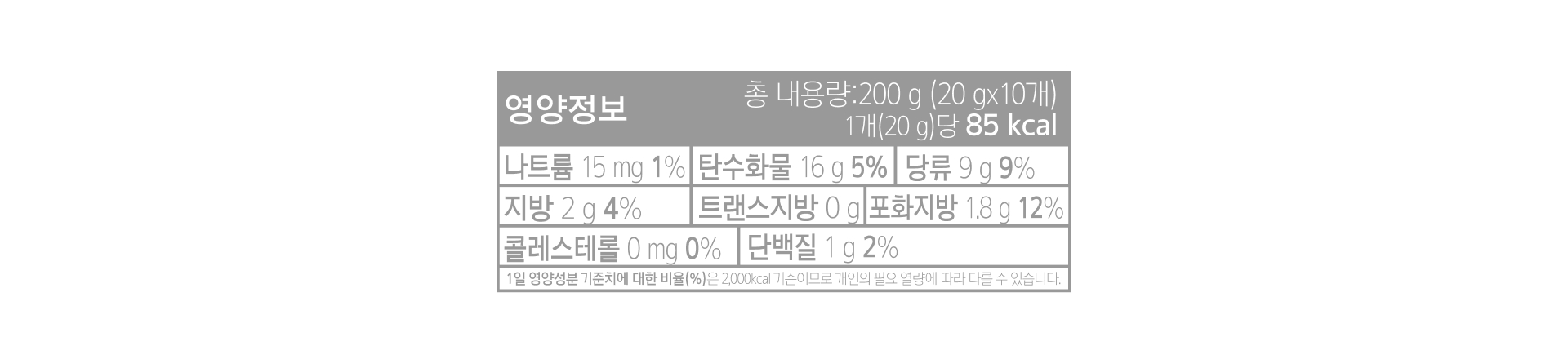 | 원재료명 및 함량 | 설탕, 식물성크림[물엿, 야자경화유{외국산(인도네시아, 필리핀, 말레이시아등)}, 제이인산칼륨, 스테아릴젖산나트륨, 글리세린디아세틸주석산지방산에스테르], 기타가공품[귀리(캐나다산), 대두(국산), 코코넛분말, 아몬드],녹차(제주산), 이산화규소, 정제소금 [대두함유] | ||